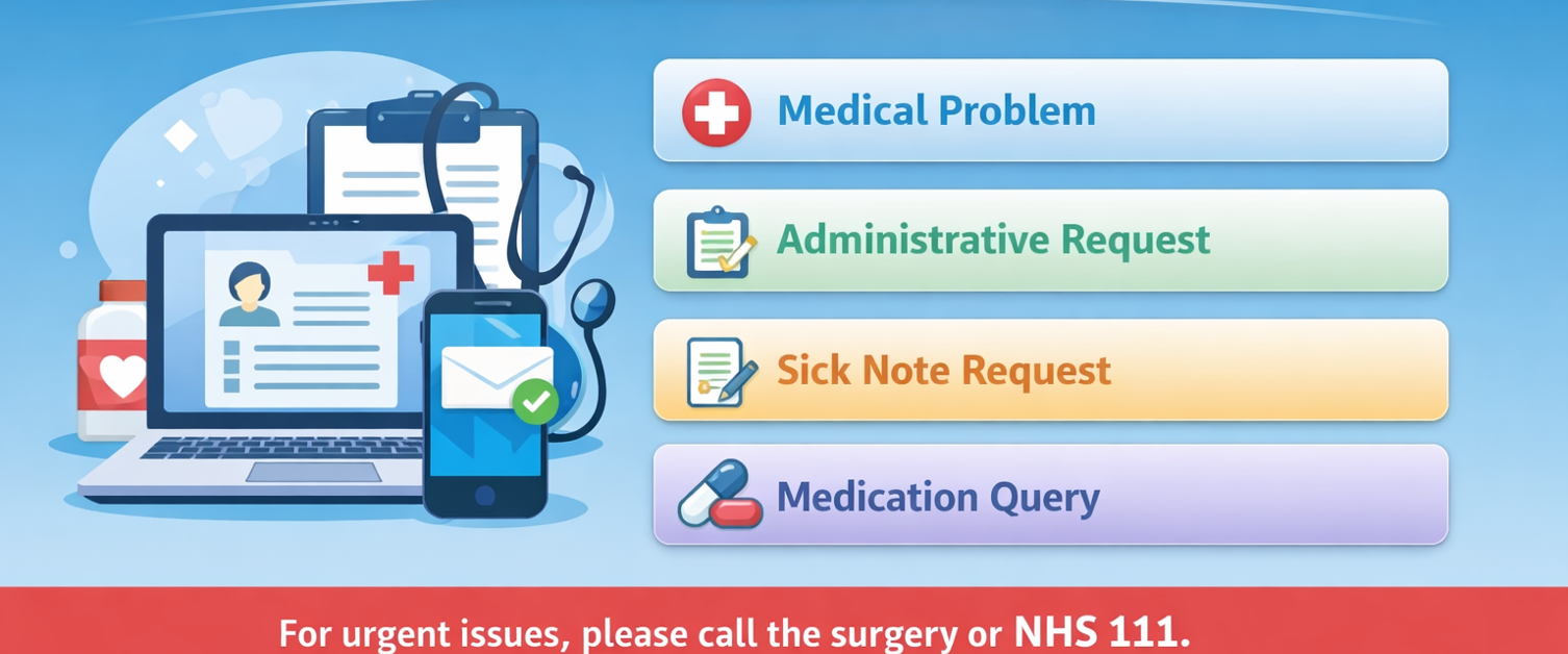 You can contact the practice online for medical or administrative queries. This is a quick and convenient way to request help without needing to call the surgery. Simply complete the relevant form and a member of our team will review your request and respond appropriately. If your problem is urgent, please contact the surgery by phone or call NHS 111.